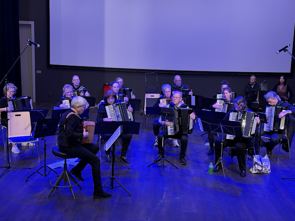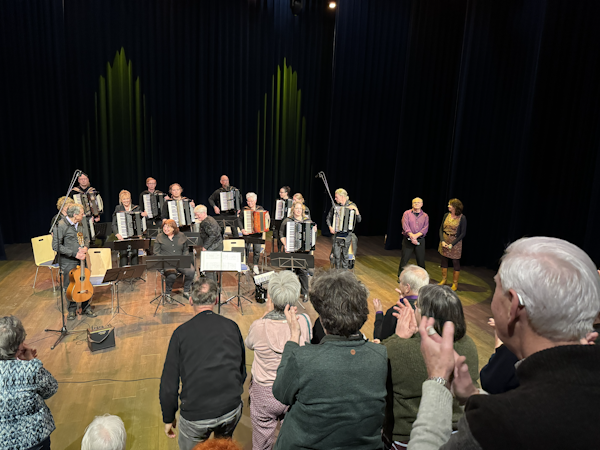 Dit jaar was voor d'Accord-Encore echter wezenlijk anders. Tijdens het concert misten we Pierre, die ons recent is ontvallen, en Jet, die door ziekte afwezig was. Vandaar werd het dirigentschap verdeeld over Riet en Karin. Ter nagedachtenis aan Pierre werd *Oblivion* toegevoegd – een stuk dat hij graag speelde en hoorde. Zijn stoel bleef leeg in het orkest, als stille herinnering aan zijn aanwezigheid.