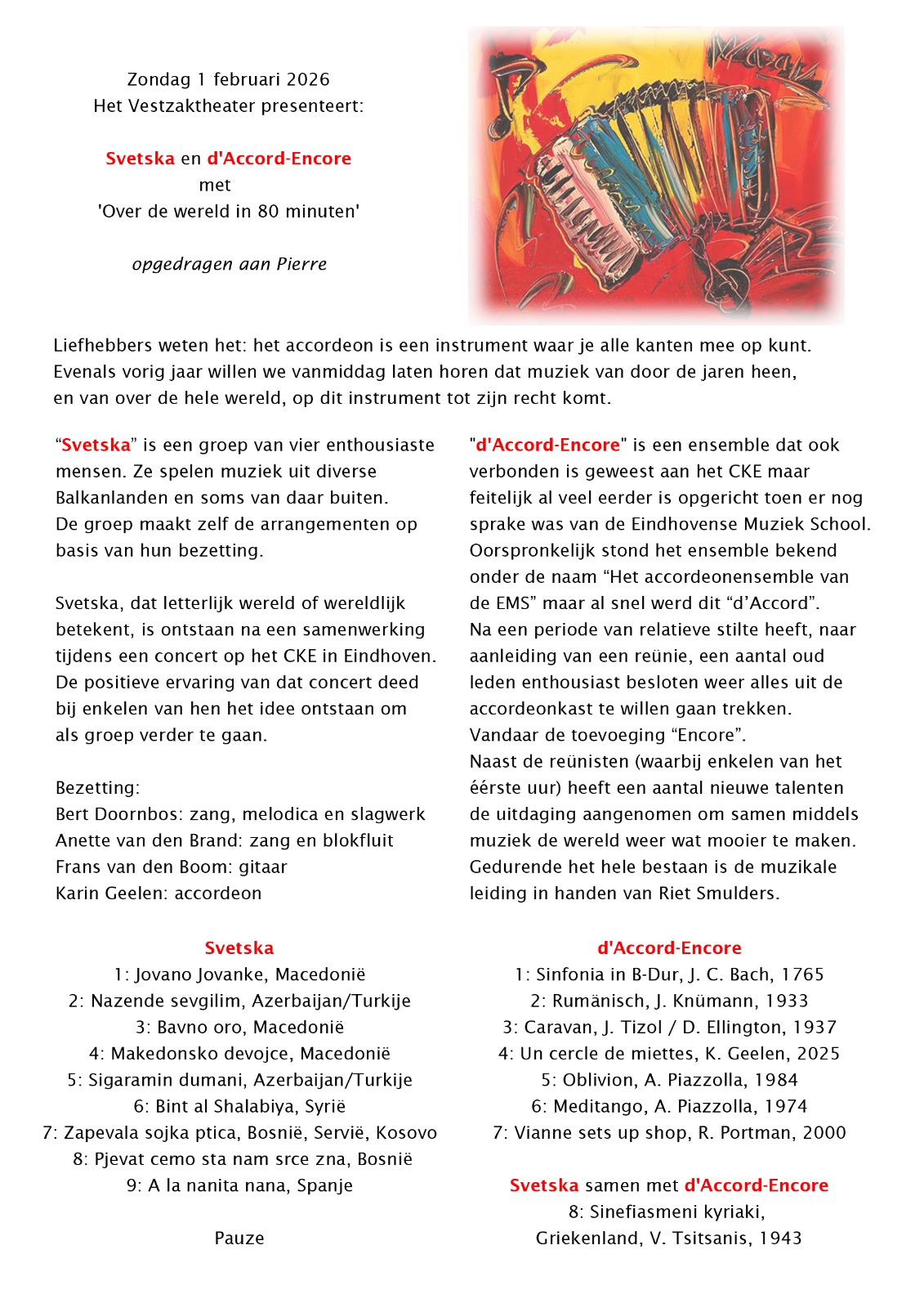 Het programma bood een mooie afwisseling: eerst een optreden van Svetska, na de pauze gevolgd door d'Accord-Encore, en ter afsluiting het gezamenlijk spelen van het laatste nummer.